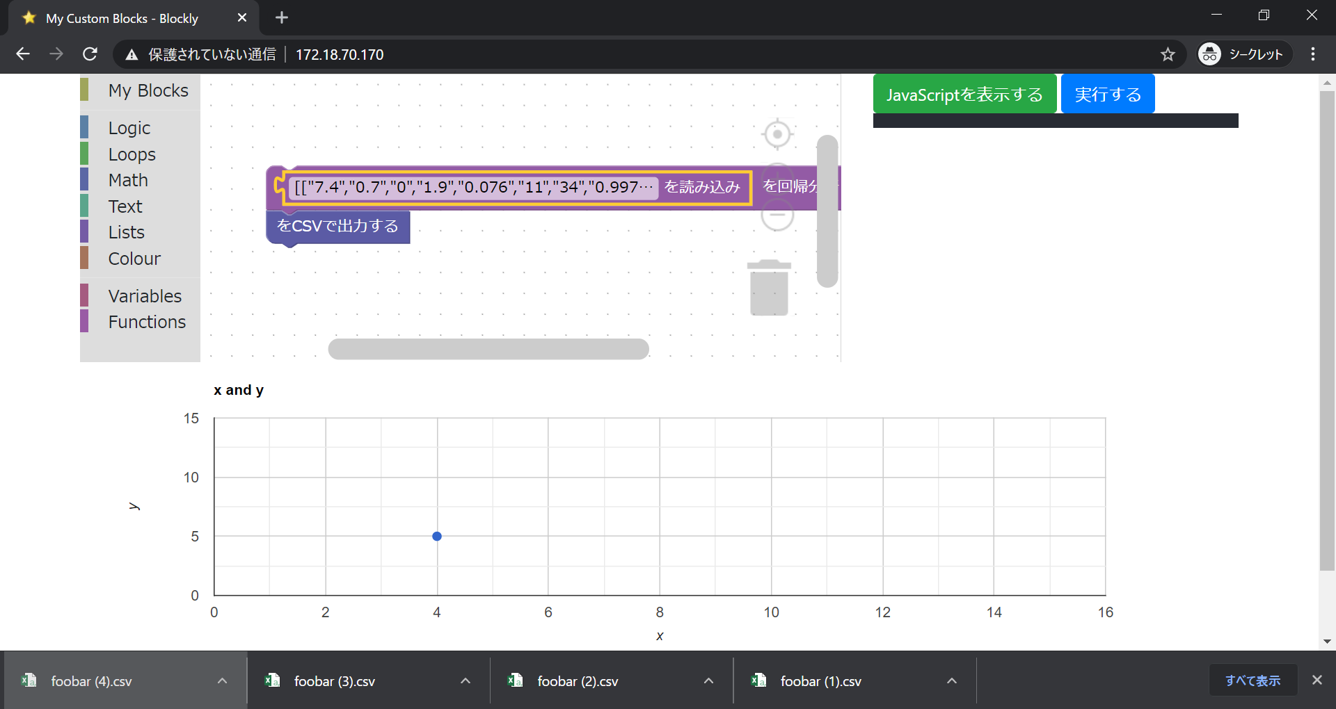 そして、ファイルを選択するブロックにこのファイルを入れる。 その後、回帰分析のブロックの中にそのブロックを入れ実行するとUbuntuのpythonで行われた回帰分析の結果がコンソールに返ってくる。コンソールはGoogle ChromeをアクティブにしてF12を押すと見れる。