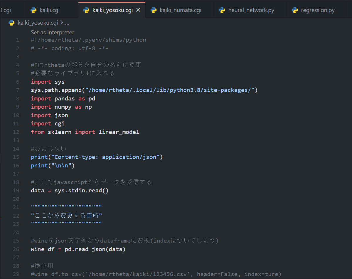 入出力を変更して動いたら.cgiのプログラムを作成して先ほどのpythonのコードをコピーペーストする。