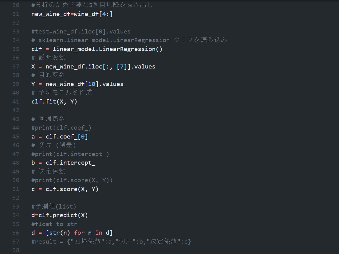 このプログラムを実行できるようにjavascript内で記述することで実行できる。 実行すると、単回帰分析ができる。