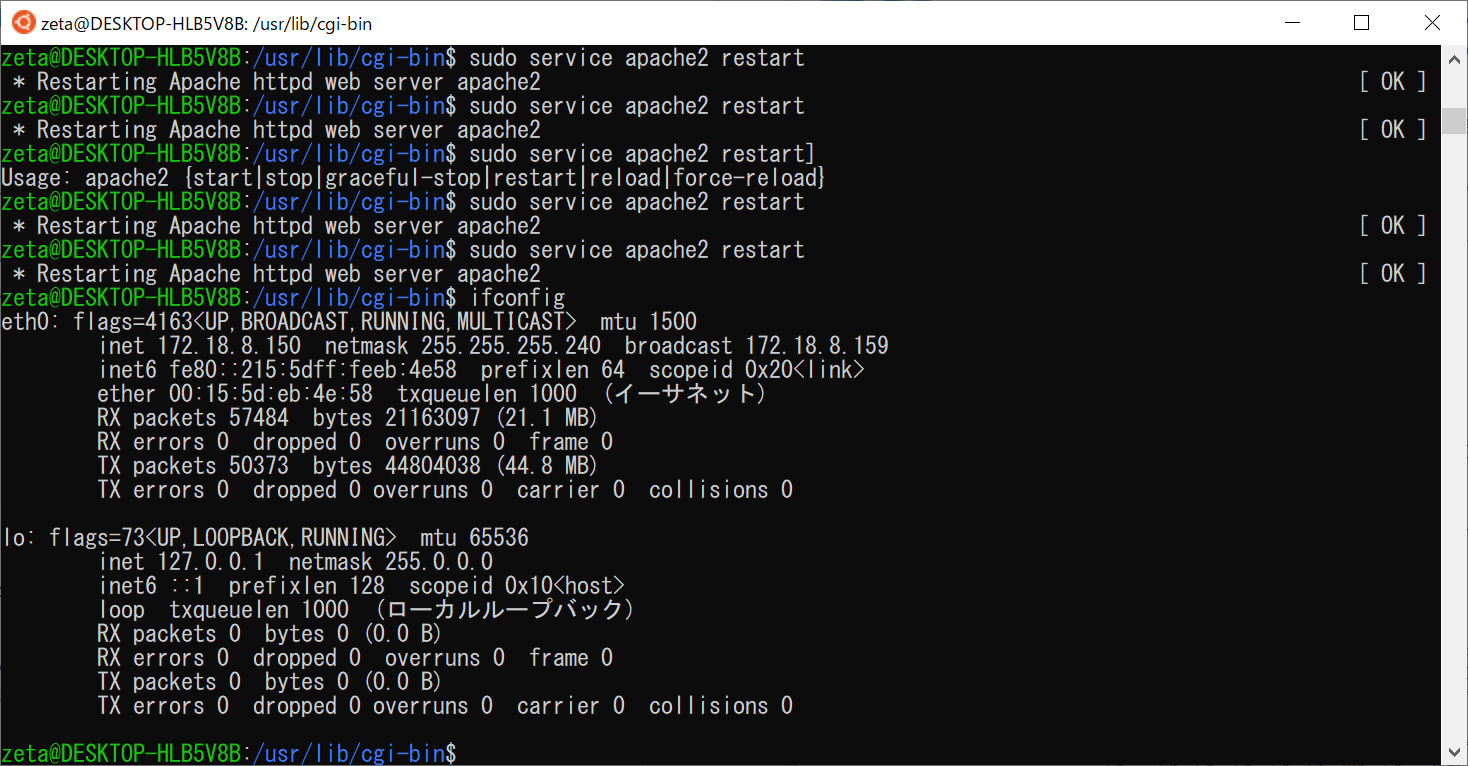 WSL2を再起動する。再起動後次のコマンドを実行する。このコマンドはapache2というWebサーバーソフトウェアをインストールしている。インターネット上で企業や官公庁の公式サイトで情報を入手したり、動画やSNSを利用したりする場合には、必ずWebサーバーソフトウェアのお世話になる。そのうち半数でApacheが稼働している。