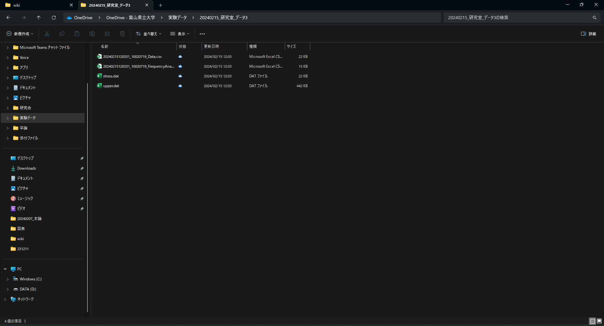 計測を終了するときは左上の計測終了をクリックし,データを保存する場合は画面に従って保存を行う. 以下のようになれば保存官僚となる(stress.datとupper.datは無視).