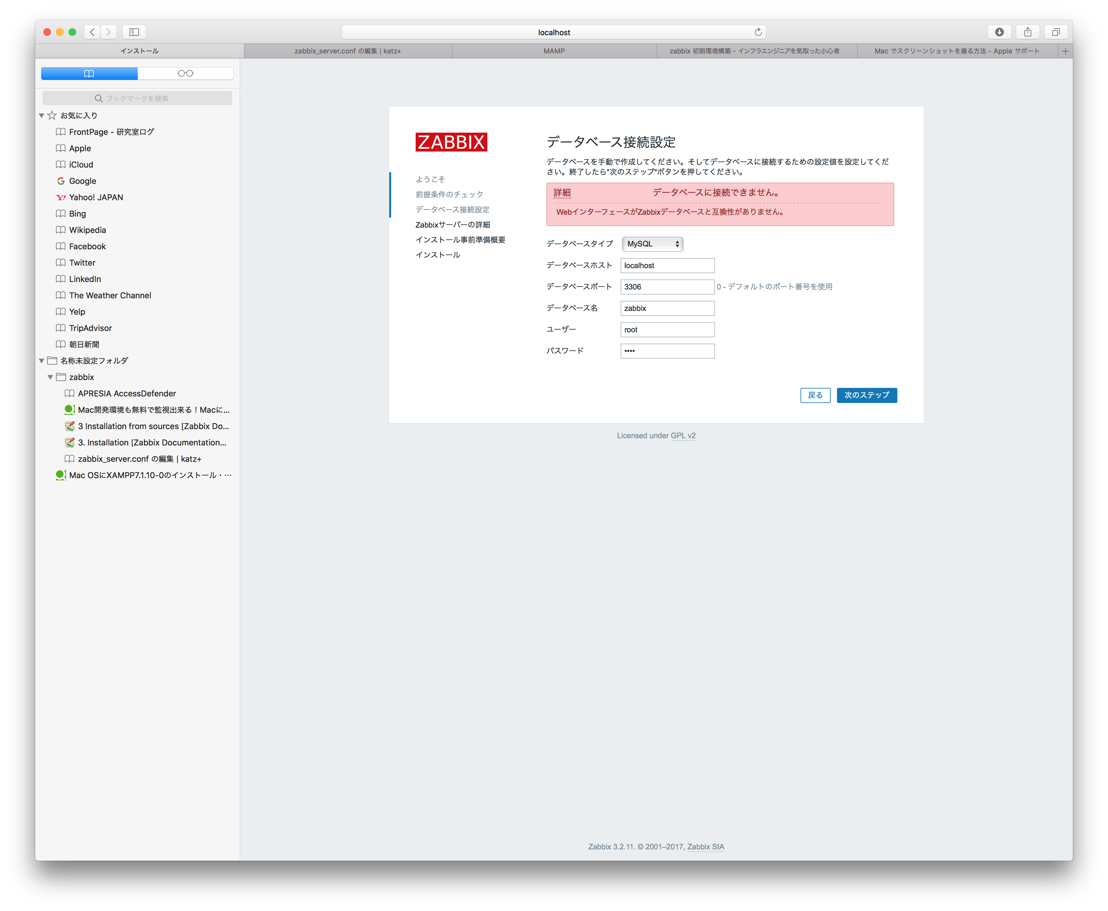 現状は、下の画像の通りwebインターフェイスとzabbixデータベースの互換性がないとでている。