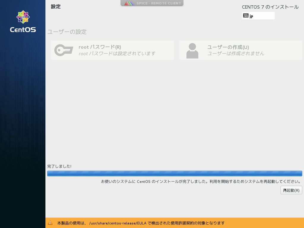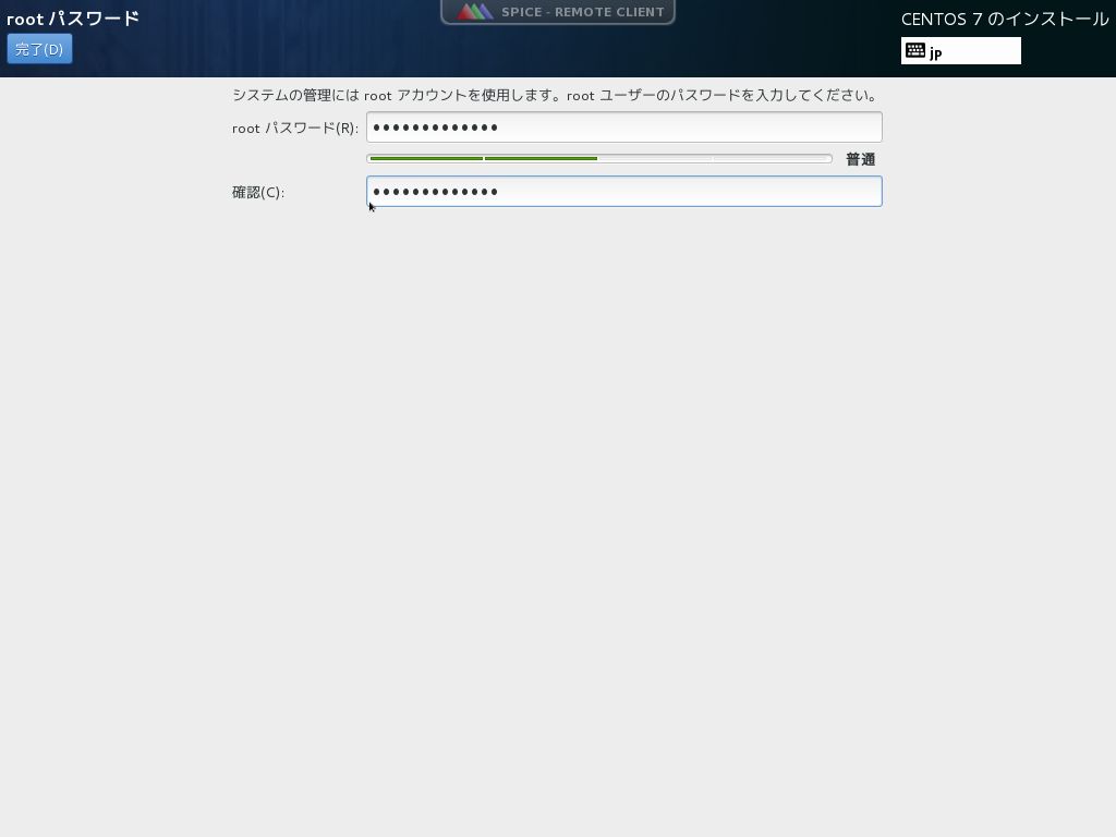 「rootパスワード」、「確認」にroot(管理ユーザー)パスワードを入力 「完了」ボタン
