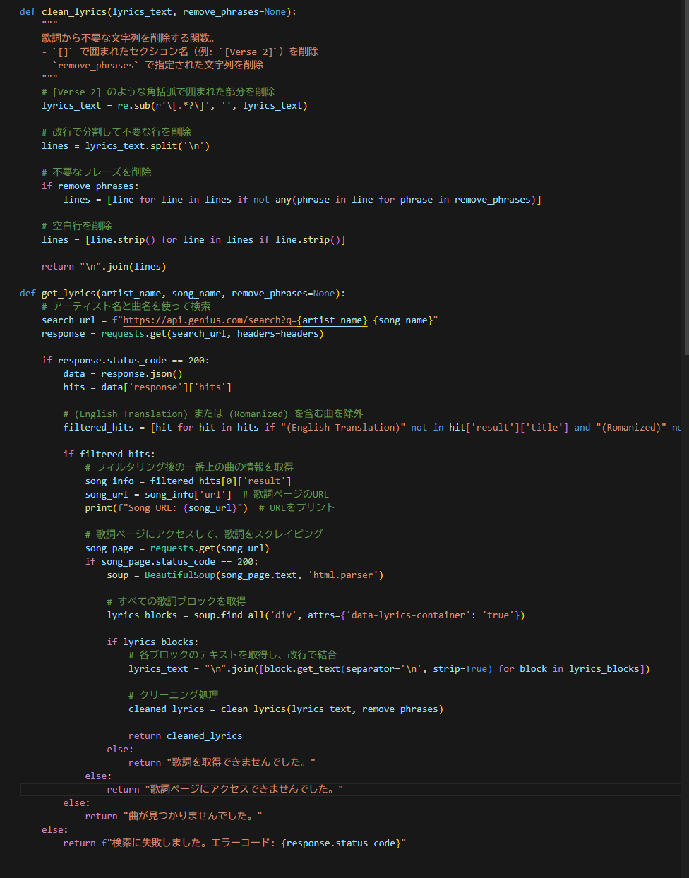 3つ目は曲名とアーティスト名から歌詞を取得するコードである