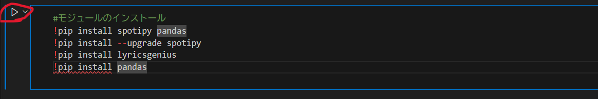 一番上はモジュールをインストールする部分。左の三角ボタンでじっこうできる。実行するとプログラム実行に必要なモジュールがインストールされる