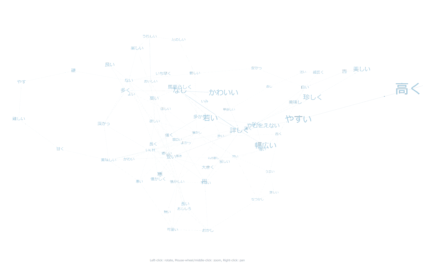 (線の太さがワードの関連度weight、線上を流れる点が向き)