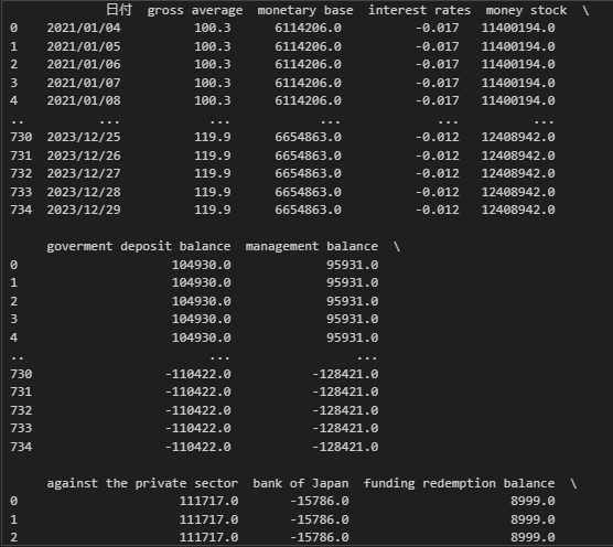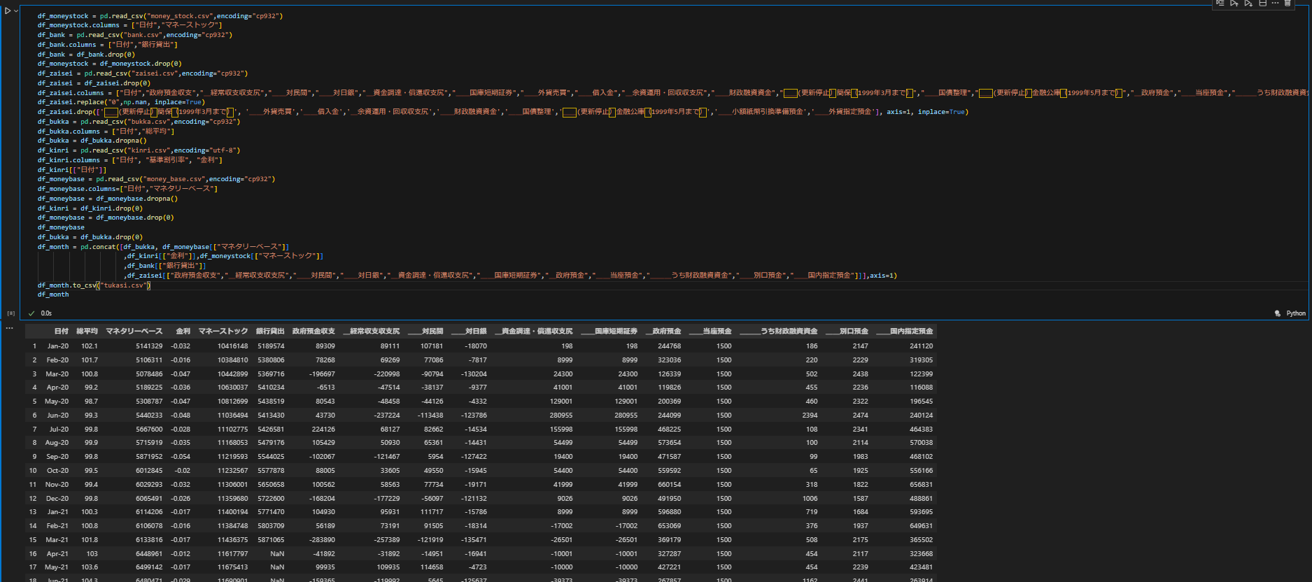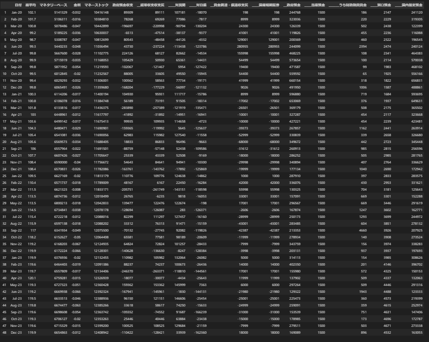 元々あるデータにスクレイピングして得た財政のデータを追加する.データの一行目を削除して新しく名前を定める.いらないデータを削除する.df_monthに元あるデータと追加したデータを合わせて組み込む.それを表示すると下のようになる.