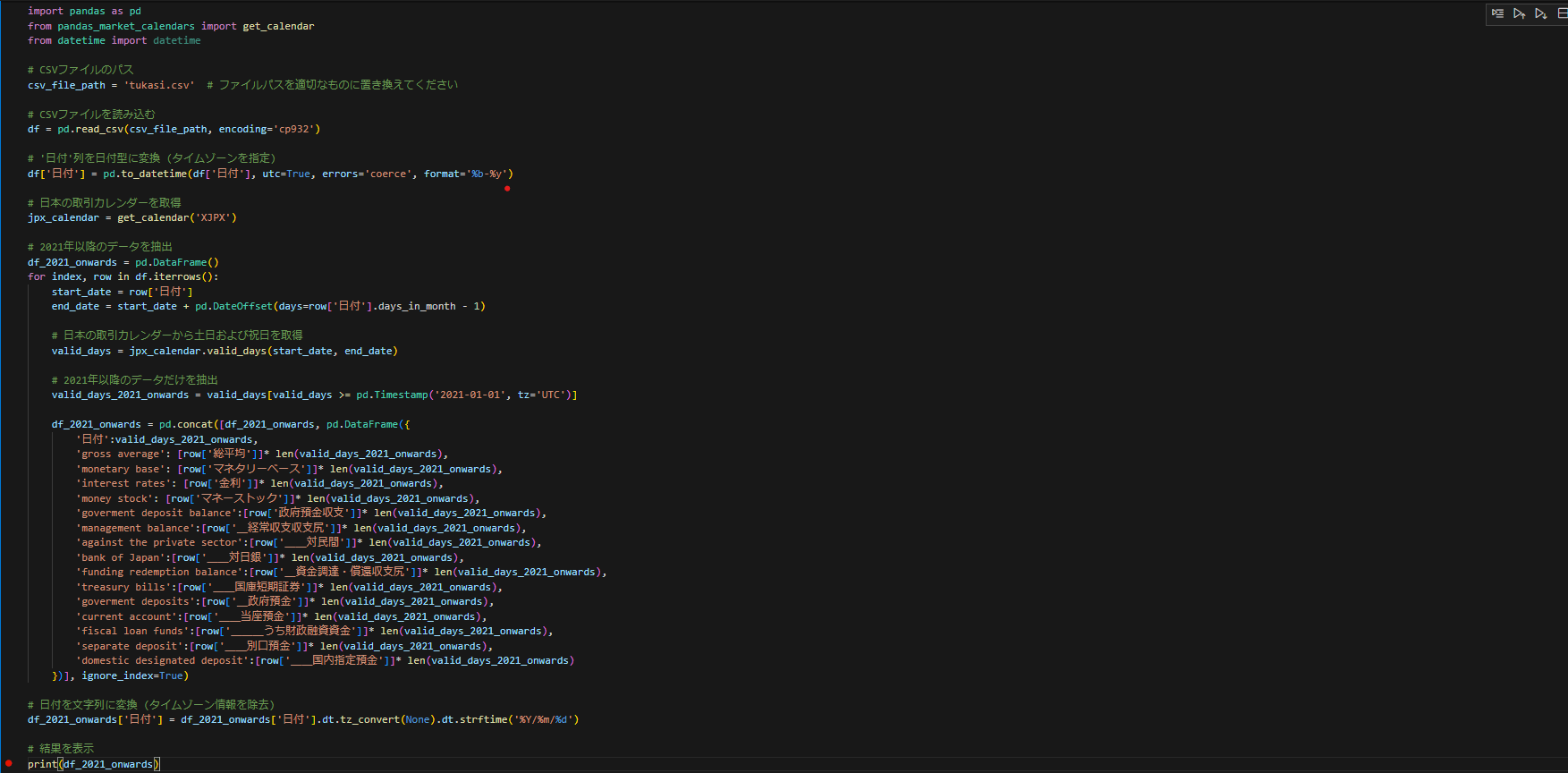 そして次に月足のデータを日足のデータにする.指定されたCSVファイル('tukasi.csv')からデータを読み込み,各行の'日付'列を日付型に変換しています。その後、各行ごとに取引カレンダーを参照.その際に,土日と祝日は削除する.2021年以降の取引日だけを抽出して新しいDataFrame(df_2021_onwards)を作成しています.最終的に,'日付'列を文字列に変換して結果を表示しています。