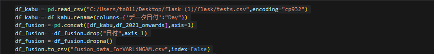 tests.csvからデータを読み取り,df_kabuを作成.'日付'列を'Day'にリネーム.df_kabutdf_2021_onwardsを結合し,df_fusionを作成する.そのDataFrameの'データ日付'列を削除,欠損値を含む行を削除.最終的なDataFrameを'fusion_data_forVARLiNGAM.csvとして保存する.