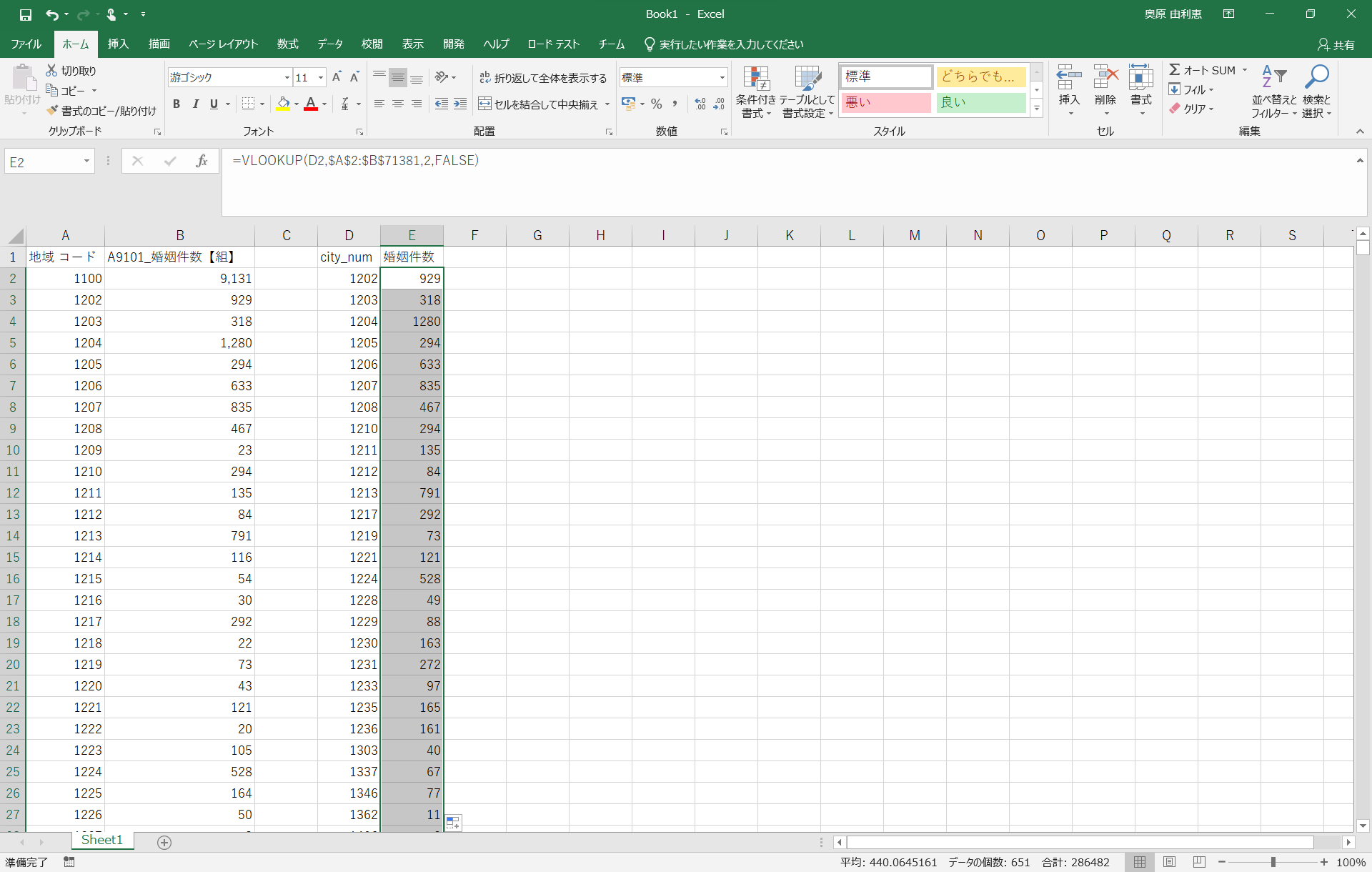 新しいExcelファイルを立ち上げ、VLOOKUP関数を使用し抜き出した