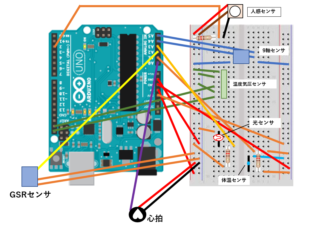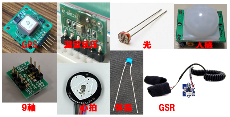カメラ,マイク,GPS受信機セット(緯度、経度、海抜高度),温湿度気圧センサー,照度センサー,赤外線焦度センサー,9軸センサーモジュール(加速度xyz、角速度xyz、磁気コンパスxyz),体温センサー,心拍,GSRセンサー(皮膚電気反射)のデータを取得する.ただし,カメラ画像とマイク音声はテキストでも取得する.