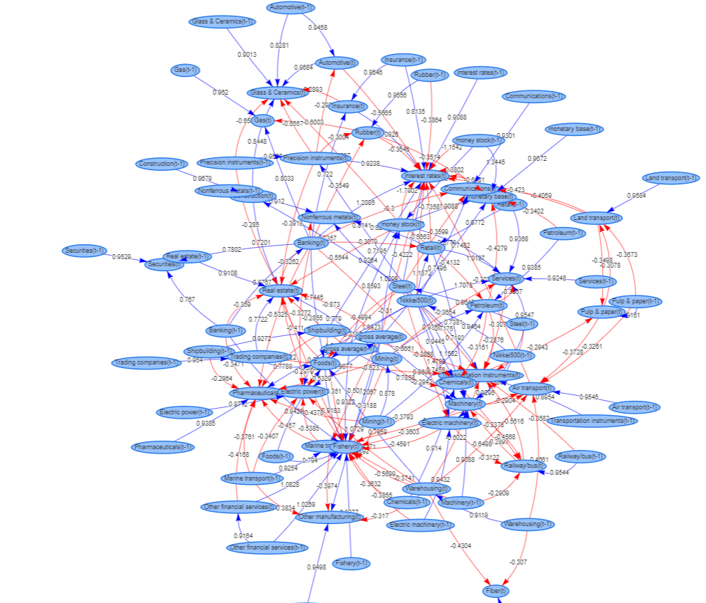 VAR-LiNGAMによる時系列を考慮した因果探索を行い,時系列を考慮した3D因果グラフの作成,また数法則発見法を用いた経済変数のモデル化を行うことで,経済変数間の影響を直感的に理解できるようなシステムの実装を目指す.