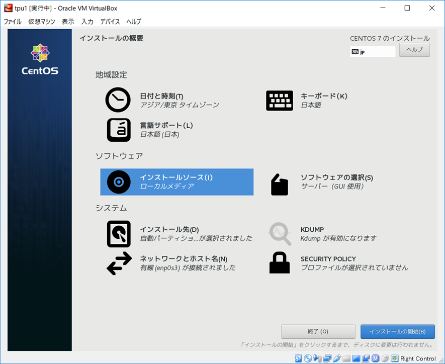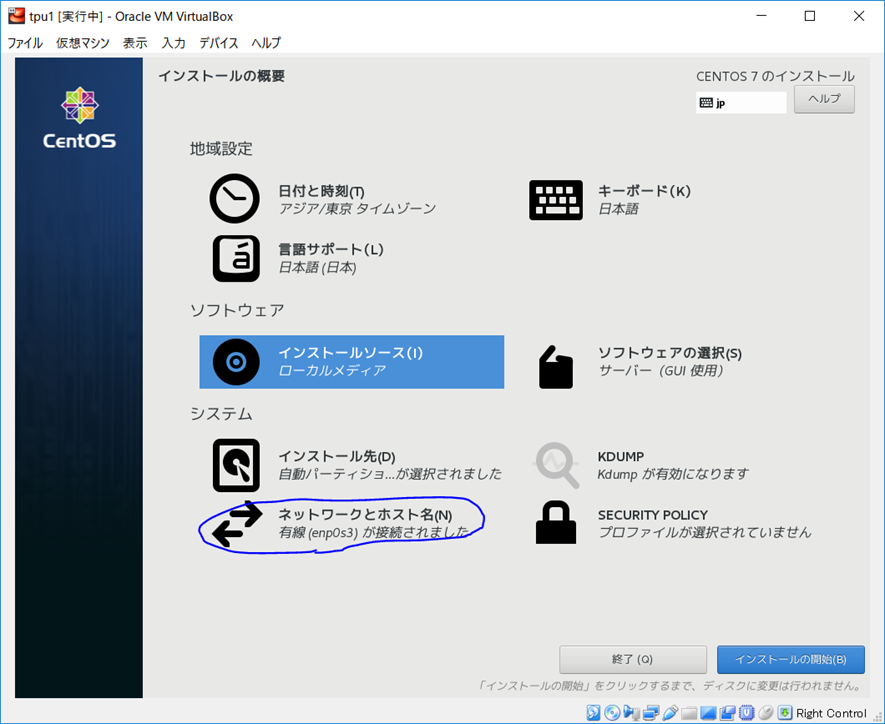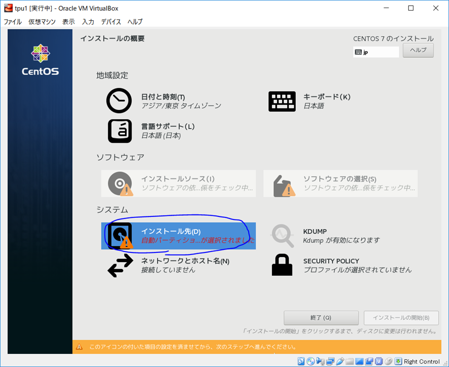 17. ここから仮想マシン上での「CentOSのインストール・セットアップ」になる。状況によってはマウスカーソルを動かす際に「コントロールの切り替え」が発生するので注意すること。通常は、仮想マシン内のカーソル移動からは、右側の「Ctrl」キーを押すことで元のカーソル動作に戻る。