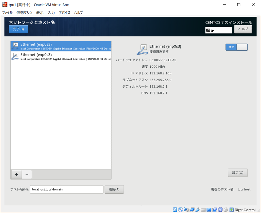 25.1 Ethernetの接続(enp0s3のみ) を「オン」(右上のスライドを変更)にして、完了する。