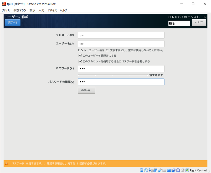 28. rootパスワードは「tpu」とする。パスワードを2回入力して「完了」を押すと、短すぎるというエラーが表示されるが、そのまま「完了」をもう1回押せばそのまま進む。