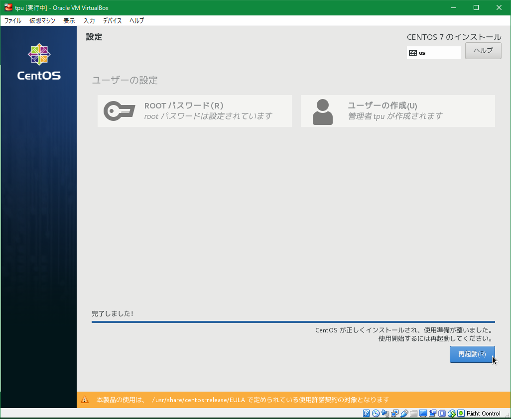 30. インストールが完了すると、右下に「再起動」ボタンが現れるので、そのまま再起動する。(仮想マシンの再起動なので、Windowsを再起動する必要はない)