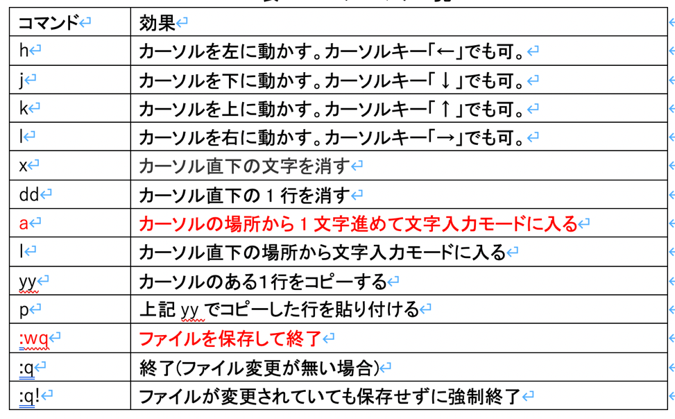 Vimで使用する主なコマンドを以下の表に示す。全て「通常モード」の時に入力します。 表1:Vimのコマンド一覧