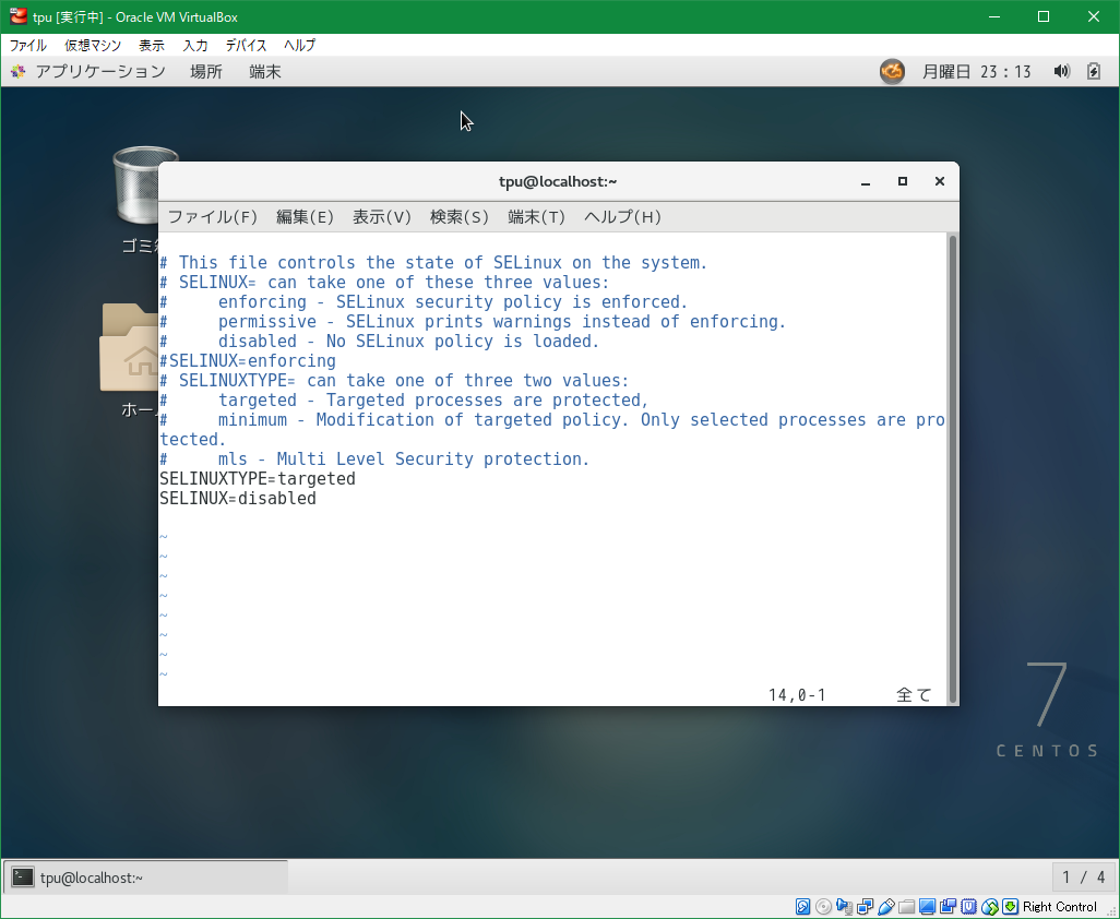 38. 早速このvimを使って、SELinuxの無効化設定を行う。コマンドは以下のとおり。 $ sudo vim /etc/selinux/config