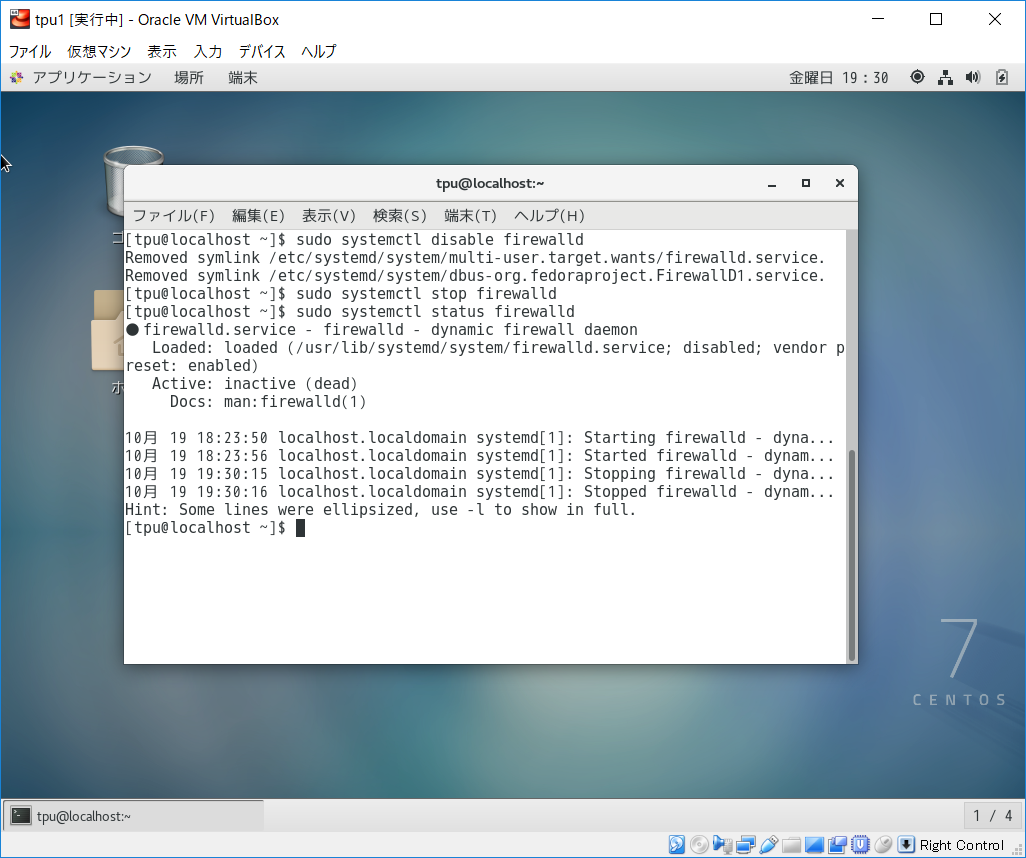 41. 次に、仮想マシンのファイアウォールを無効化する。以下のコマンドを実行する。 $ sudo systemctl disable firewalld $ sudo systemctl stop firewalld