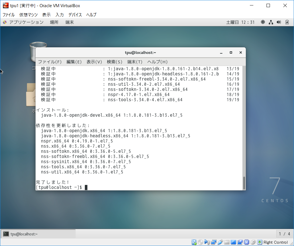 45. 次に、Java JDKのインストールをするために、以下のコマンドを入力する。 $ sudo yum –y install java–1.8.0–openjdk–devel mpich mpich-devel gcc-c++ openssl-devel 下のような画面になれば成功している。