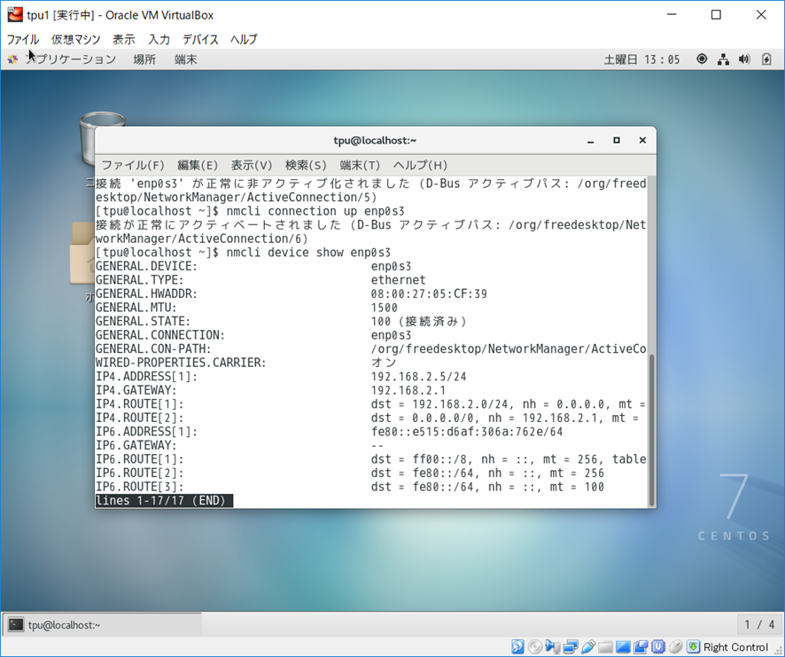 53. 以下のコマンドを入力して、自分の設定したIP番号で動作しているか確認できればよい。(下図は学籍番号1815005の場合) $ nmcli device show enp0s3 確認後Ctrl+Cで抜ける。