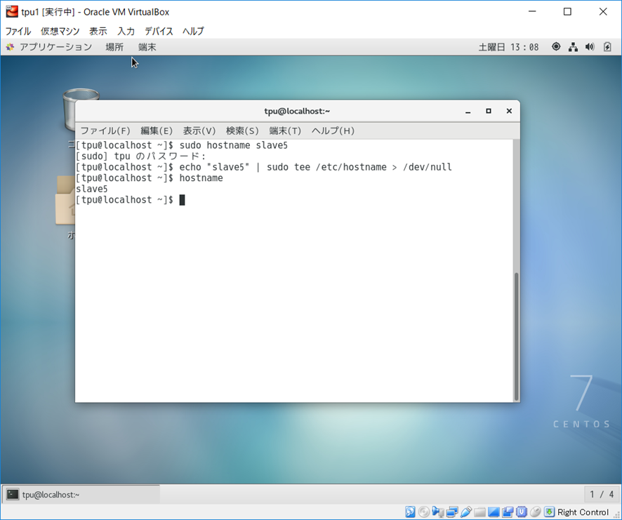 55. 仮想マシンのホスト名を設定する。以下のコマンドを順番に入力する。XXXの部分は、先ほどと同じ数字にする。 $ sudo hostname slaveXXX $ echo “slaveXXX” | sudo tee /etc/hostname > /dev/null 以下のコマンドを入力して「slaveXXX」と表示されれば成功している。 $ hostname 下図は、学籍番号1815005の例である。