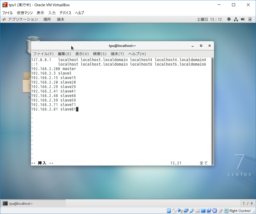 56. /etc/hostsファイルの編集をする。このファイルは、IP番号とホスト名の対応表である。 以下のコマンドで編集を開始する。 $ sudo vim /etc/hosts 既にある127.0.0.1と::1で始まる2行はそのままに、その後ろに以下の行を追加する。 ○は、自分のmaster番号(0か1か2か3)、×は自分の学籍番号下2桁、□は班のペアの学籍番号下2桁を入力する。