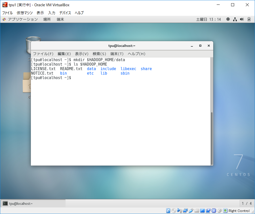 47. その後、ホームディレクトリにhadoop-2.8.5を展開したいので以下のコマンドを入力する。 $ tar xvzf hadoop-2.8.5.tar.gz 48. ホームディレクトリでlsと入力して下図のように青色の「hadoop-2.8.5」と赤色の「hadoop-2.8.5.tar.gz」が両方とも表示されれば、成功している。 $ ls