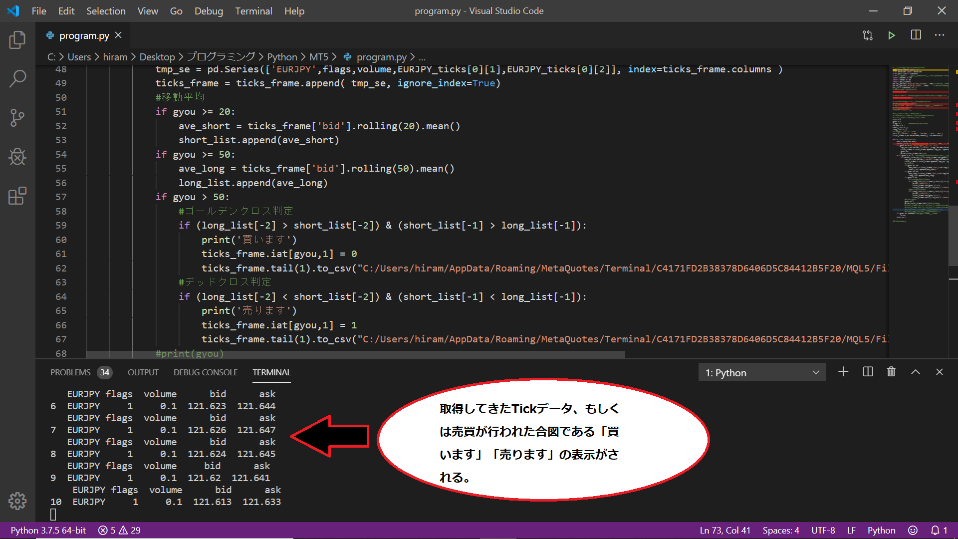 MT5を起動した状態でdemo.pyをコマンドプロンプトから実行することで、自動売買が開始される。