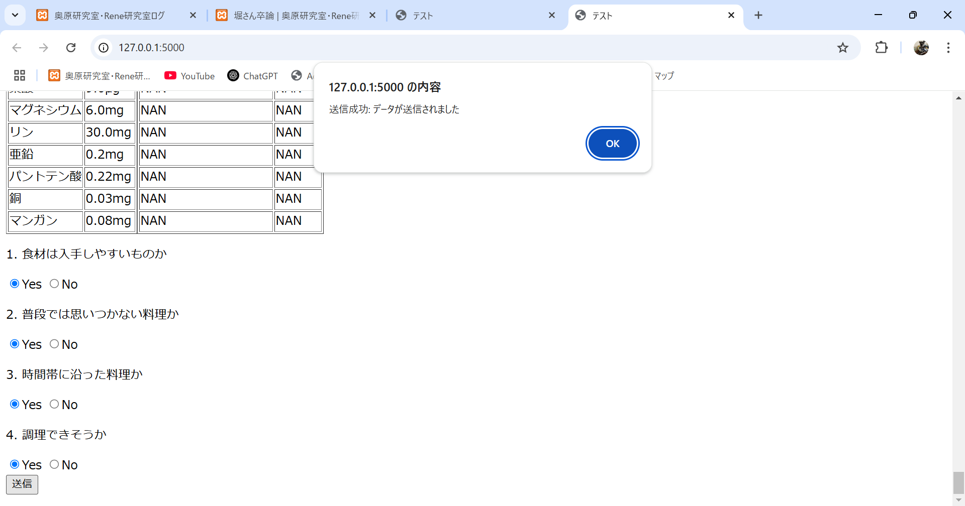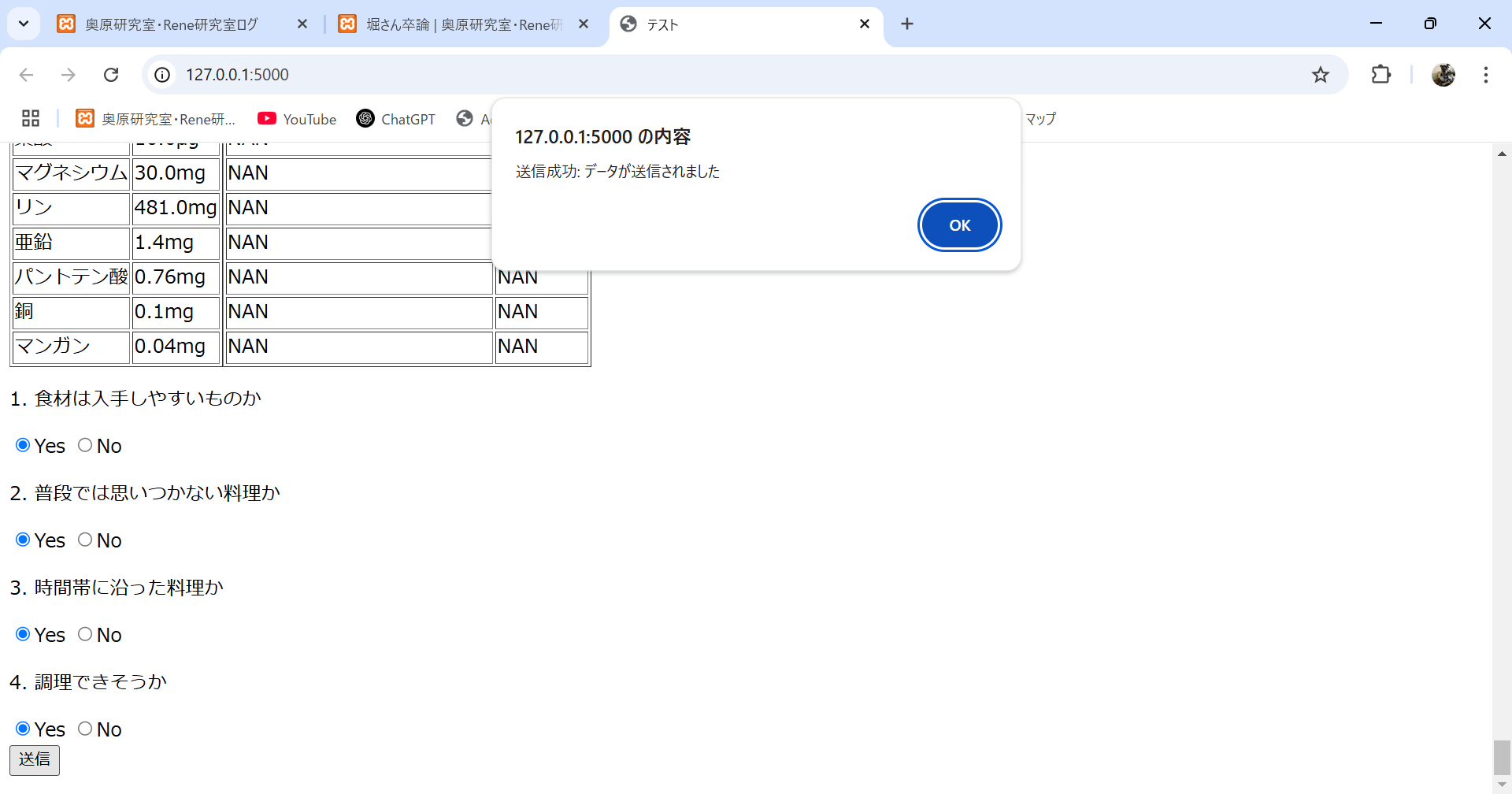 料理ごとの項目を選択していき, [送信]を押す. 画像通りになると, 送信できている.