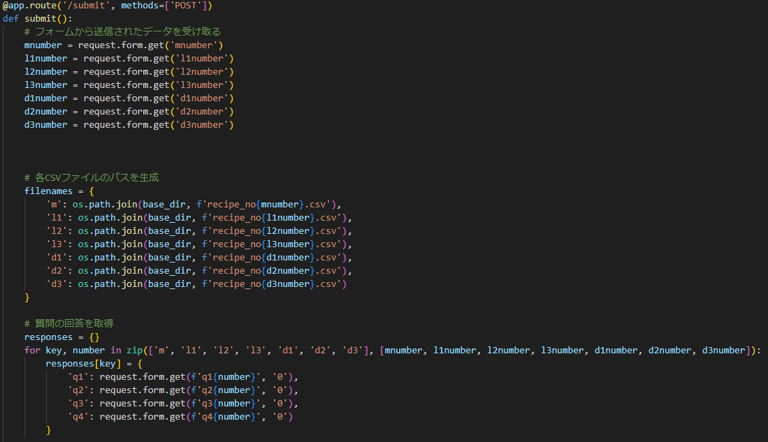 mnumber, l1number, l2number, ... などの値をフォームから取得(ユーザが回答したレシピナンバーに対応している)。