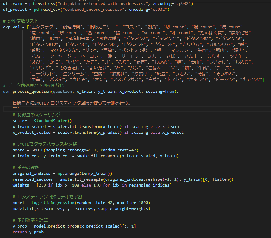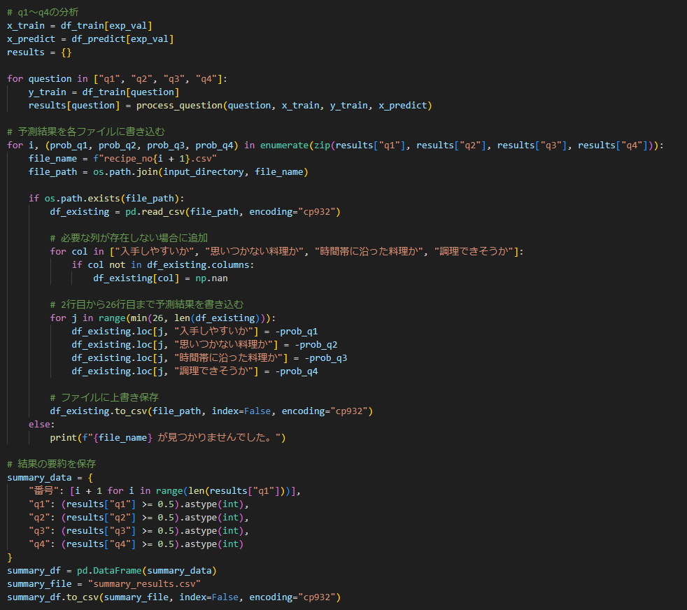 2行目から26行目まで の範囲で、予測確率を -prob_q1 などの形で代入(負の値ににしているのは、NSGA-Ⅱでは二変数の最小化を行うため)。