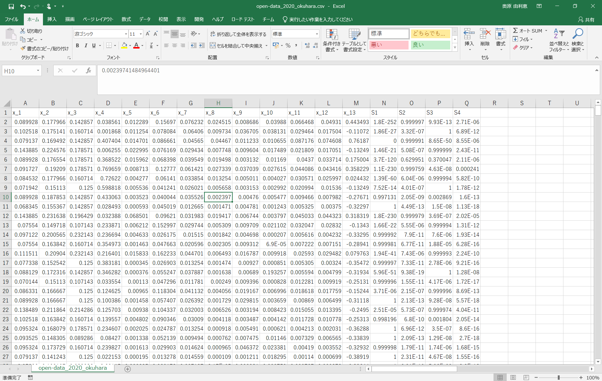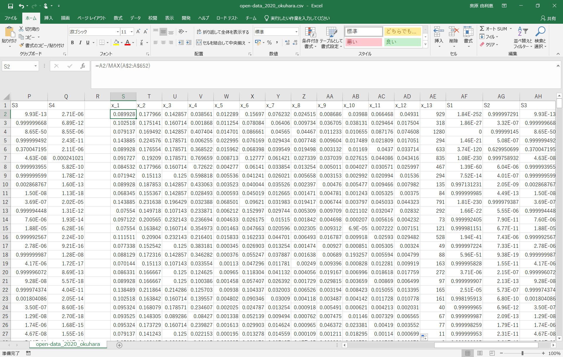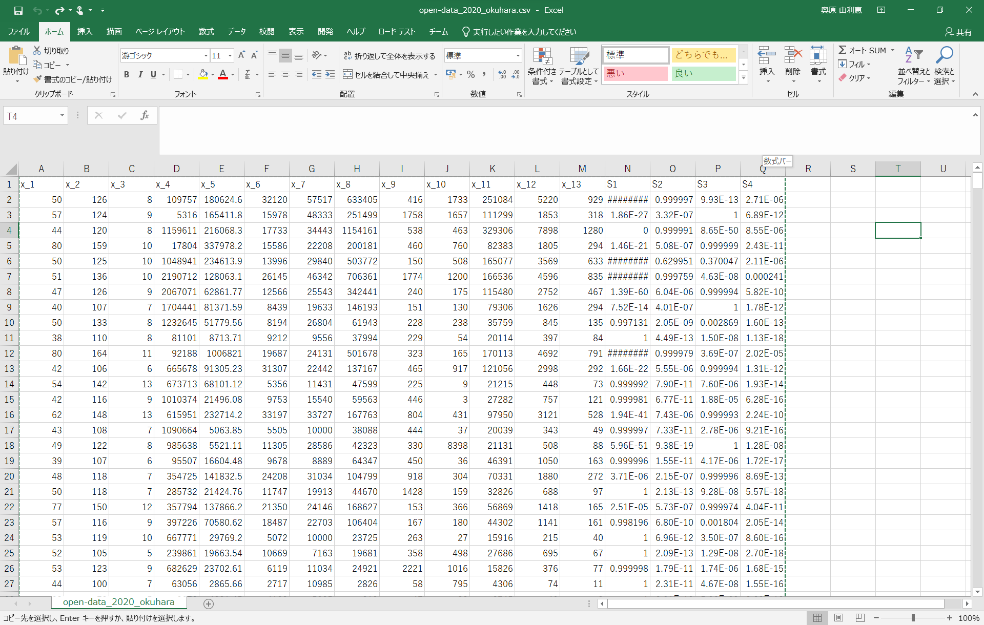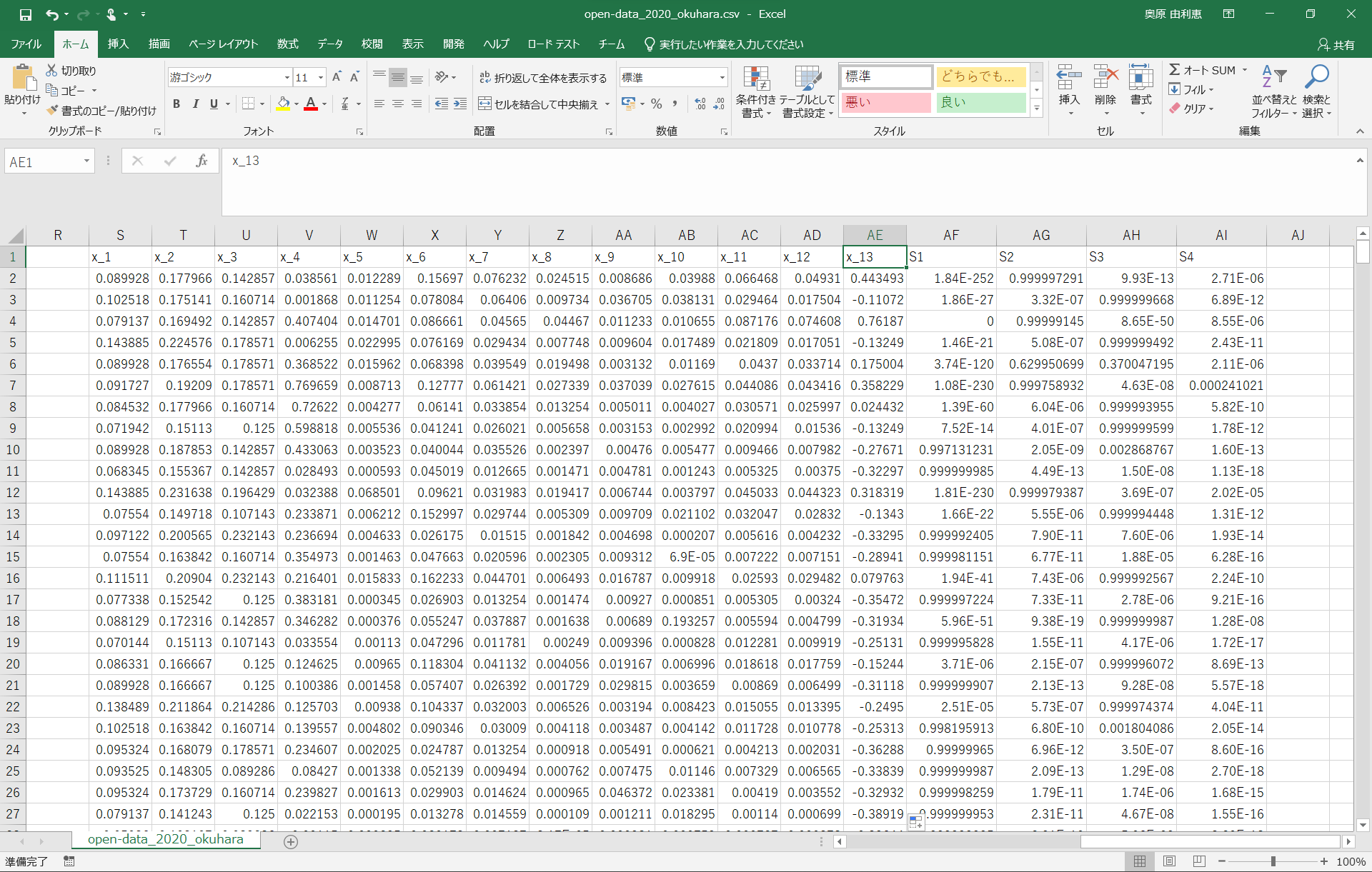 open-data_2020copy.csvの1行目を画像のようにx_1からx_○と書き換える(x_1とかの書き方じゃなくてもいい)