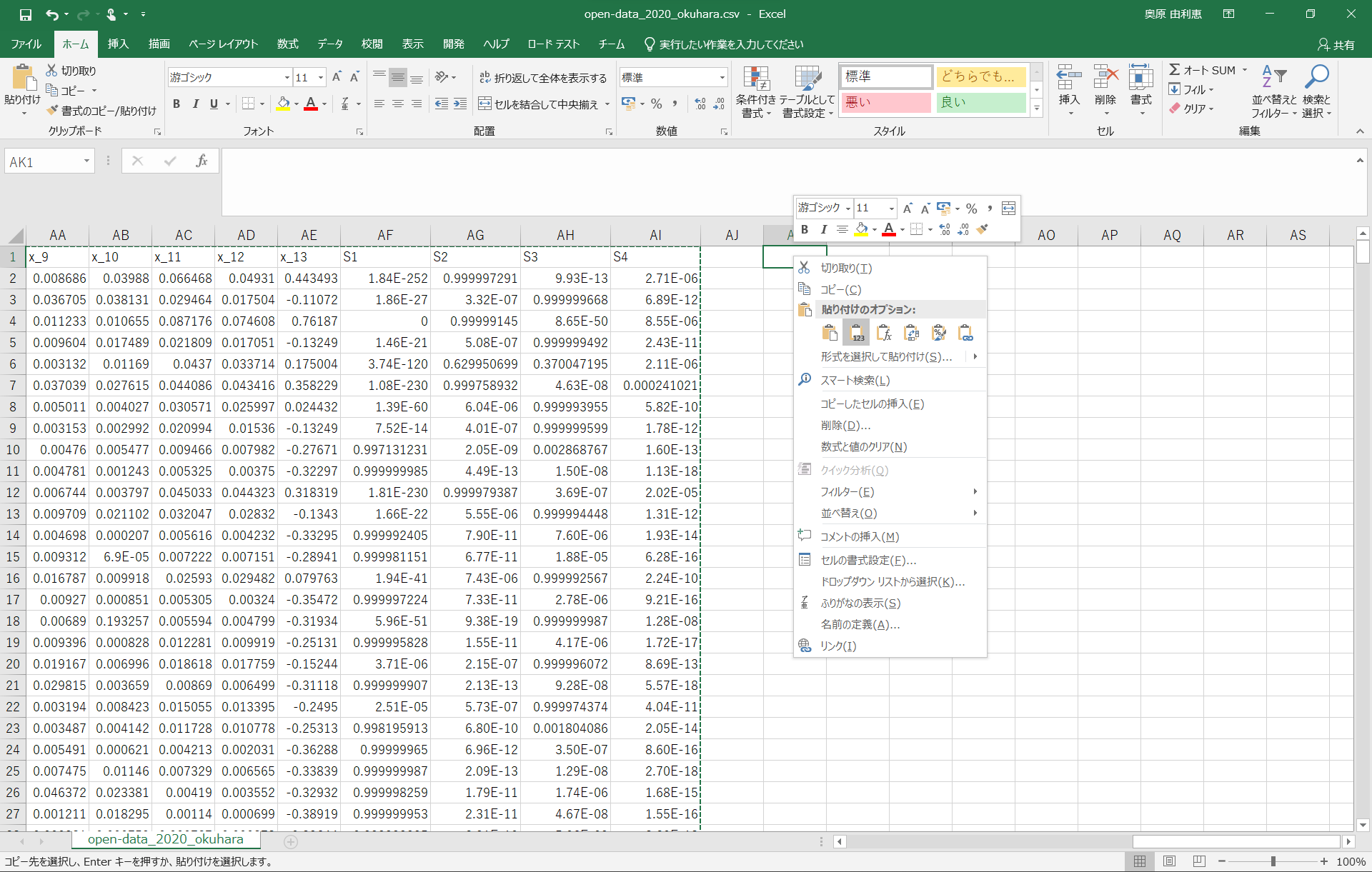 open-data_2020_okuhara.csvのExcelをコピーして、コピーしたものを使用していく