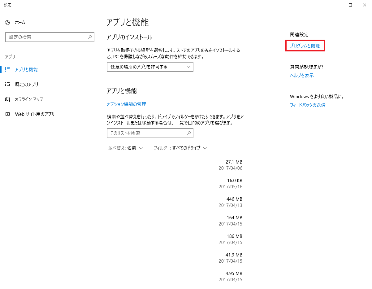 スタートボタンを右クリックして、アプリと機能をクリックする。