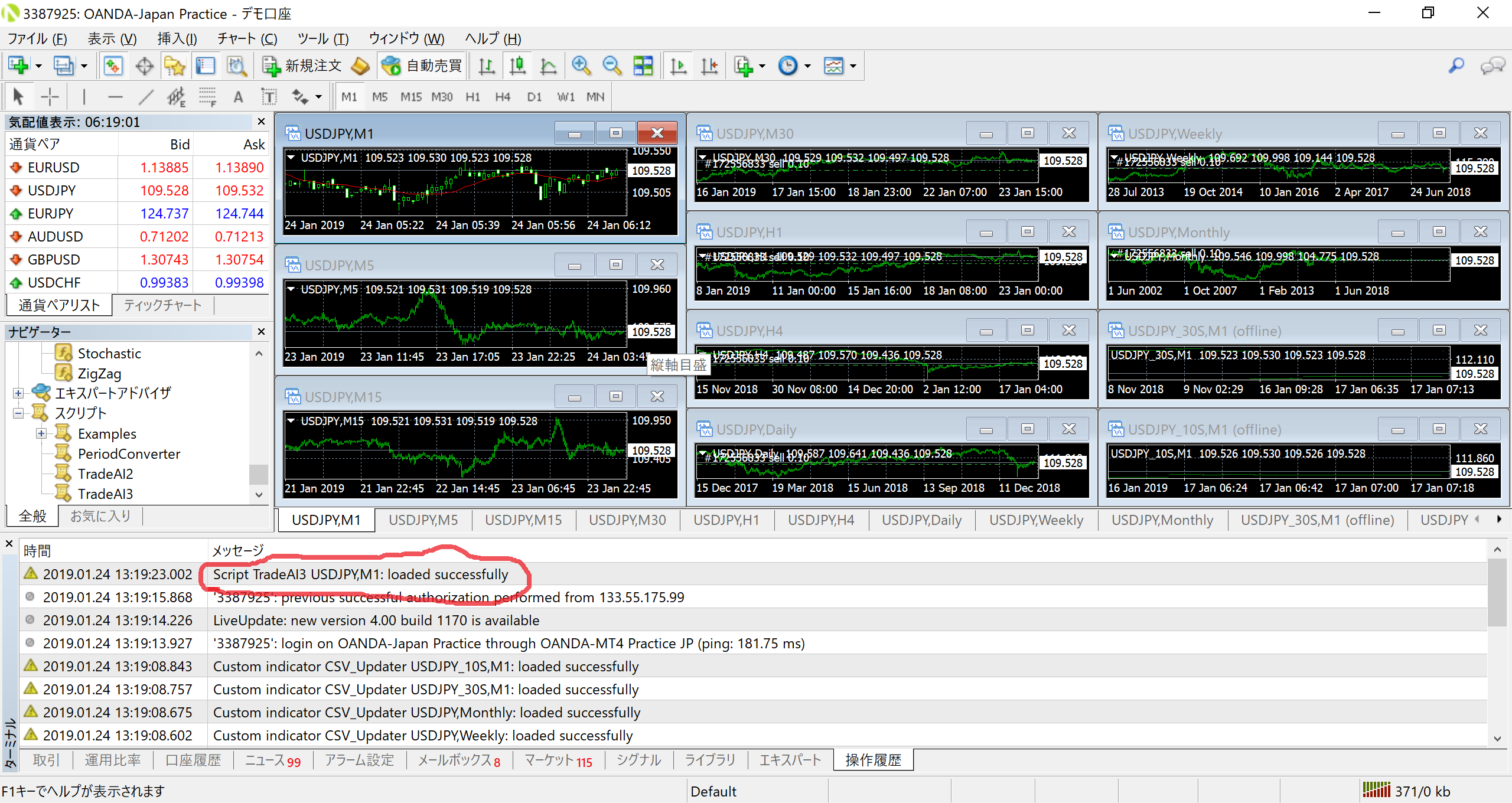 まず、MT4を開いて一分足から月足までのUSDJPYのチャートを開く。