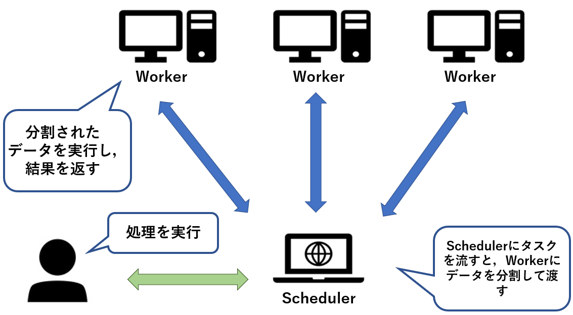 daskは、処理を支持する「schedule側」と、処理をする「worker側」に分かれる。イメージは以下の通り。