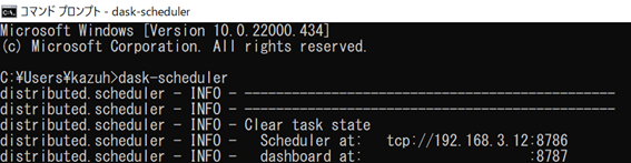コマンドプロンプトを開いて「dask-scheduler」と入力する。