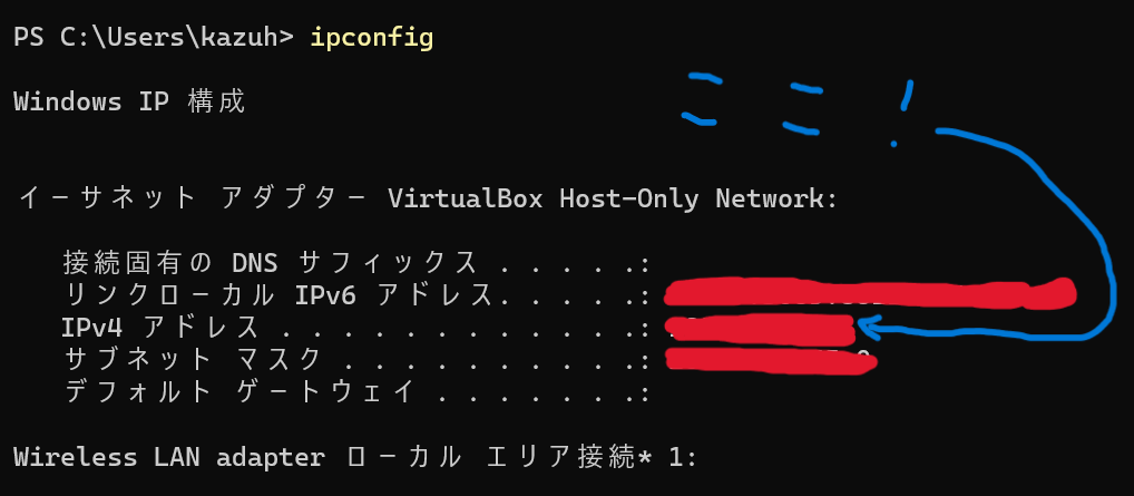 →コマンドプロンプトを開いて「ipconfig」と入力すると確認することができるよ
