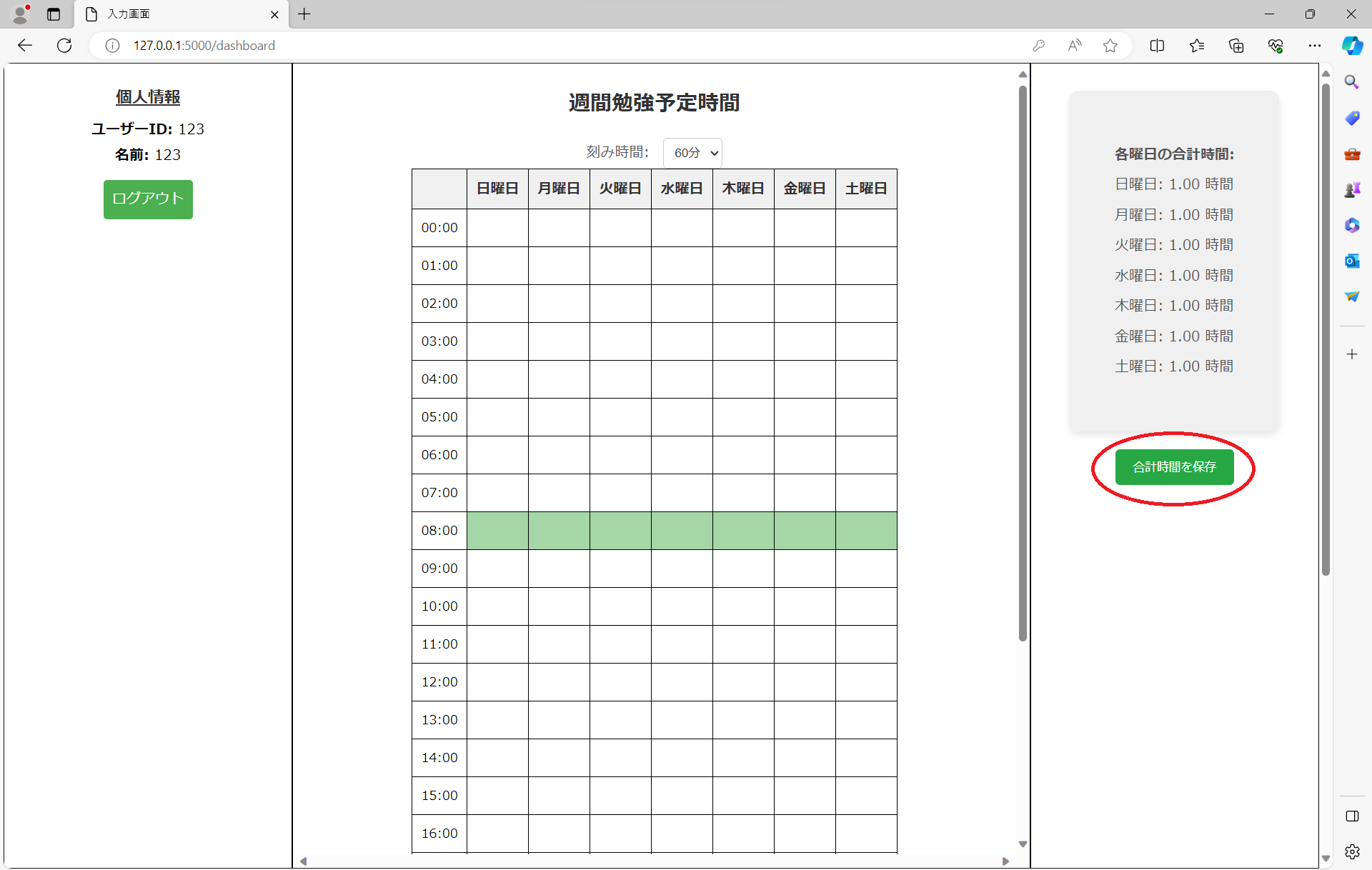 緑に変わったら右側にある「各曜日の合計時間」にも連携されている