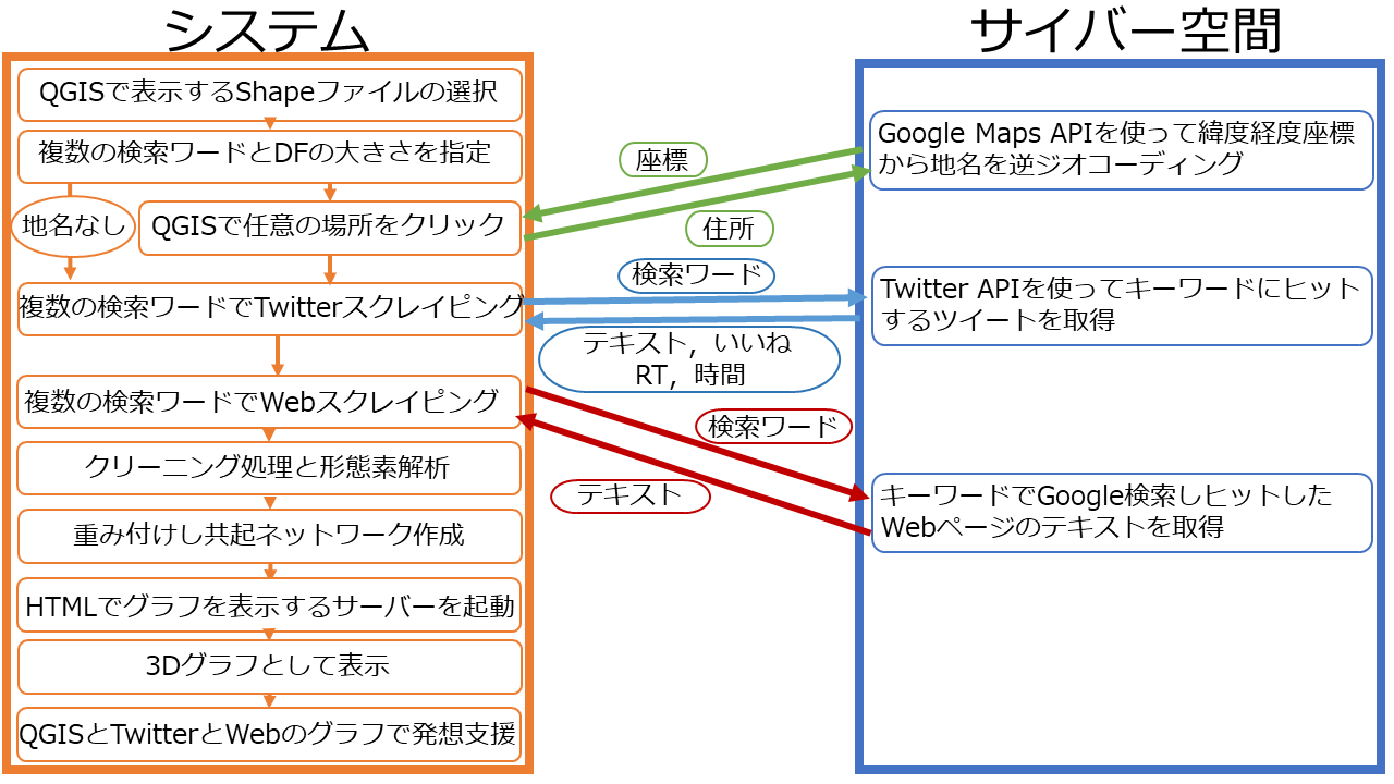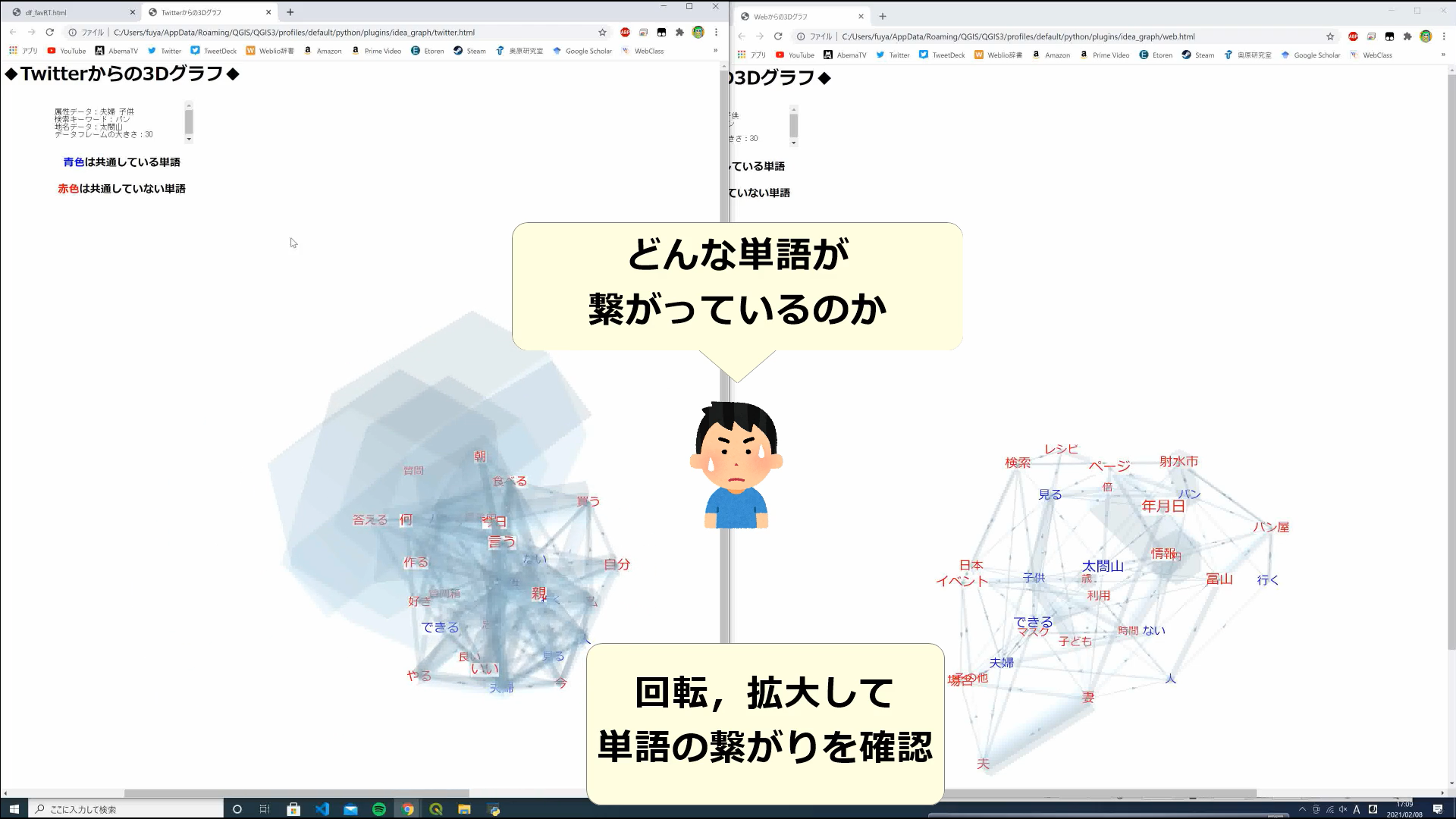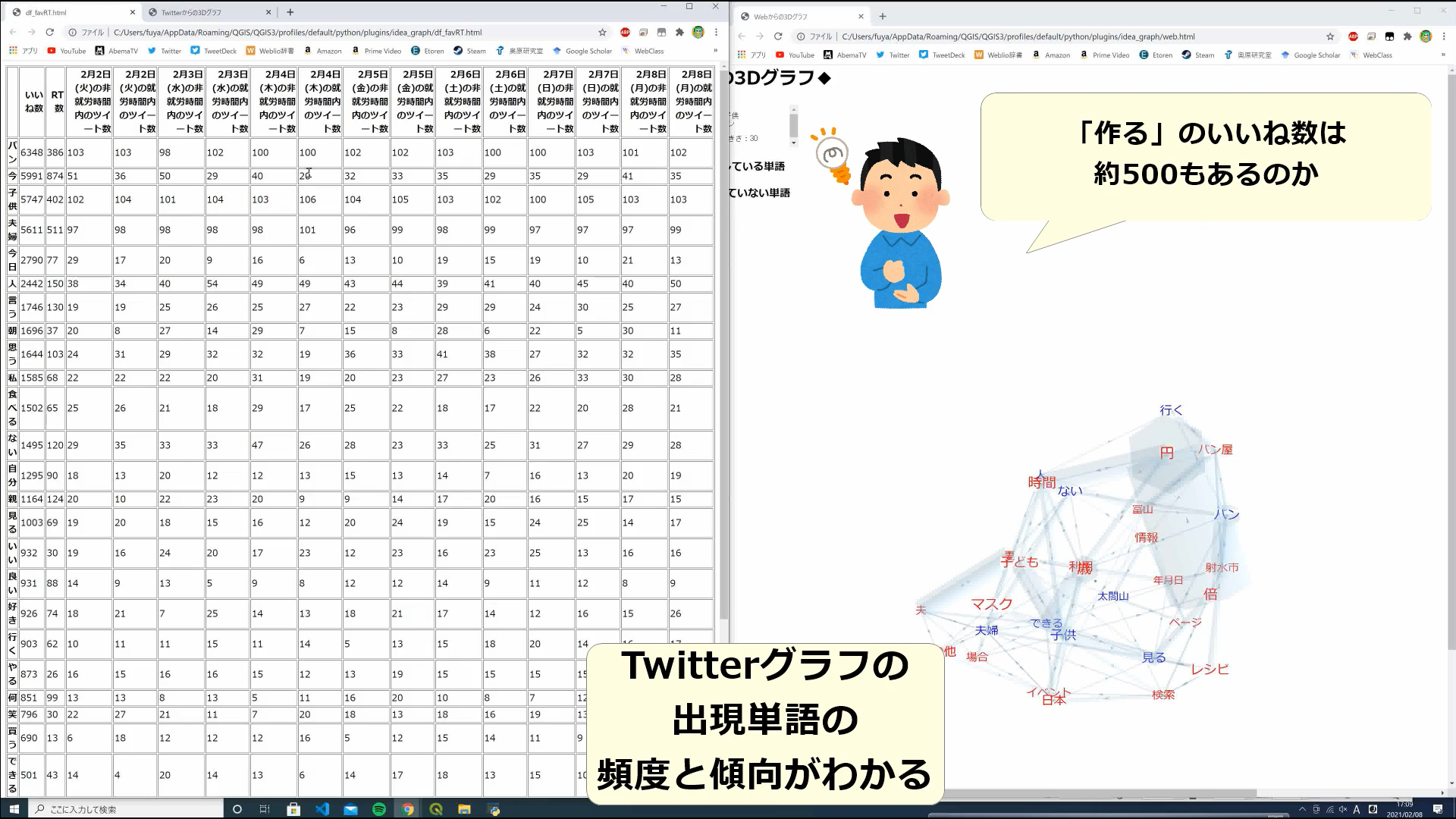 最後まで行くとhtml表示用のサーバーのウィンドウが自動で立ち上がり,twitterとWebの3DグラフとTwitterの統計を示す表のHTMLが自動で表示される